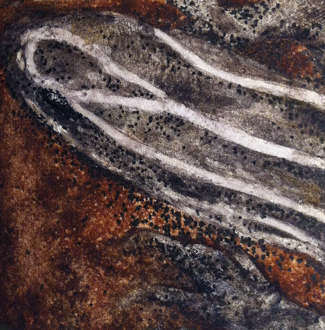 ANSWER TO MYSTERY TECHNIQUE #35: I began by using plastic wrap to apply a little gesso for a slight texture; after it dried, I added a layer of diluted yellow acrylic ink. All the other colors came out of one tube of paint – Daniel Smith’s Serpentine Genuine, one of their PRIMATEK mineral pigments. I also added some Granulation Medium for more texture.