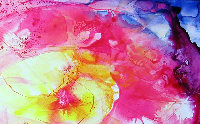 ANSWER TO MYSTERY TECHNIQUE #41: I began by coating Arches Cover with diluted sizing. After it dried, I used a large brush to draw the outline of a shape with water; I then added enough water to create a puddle on the surface, which caused the paper to form hills and valleys. Next I added liquid watercolor. The edges of the puddled paint dried multiple times, forming a series of lines.
