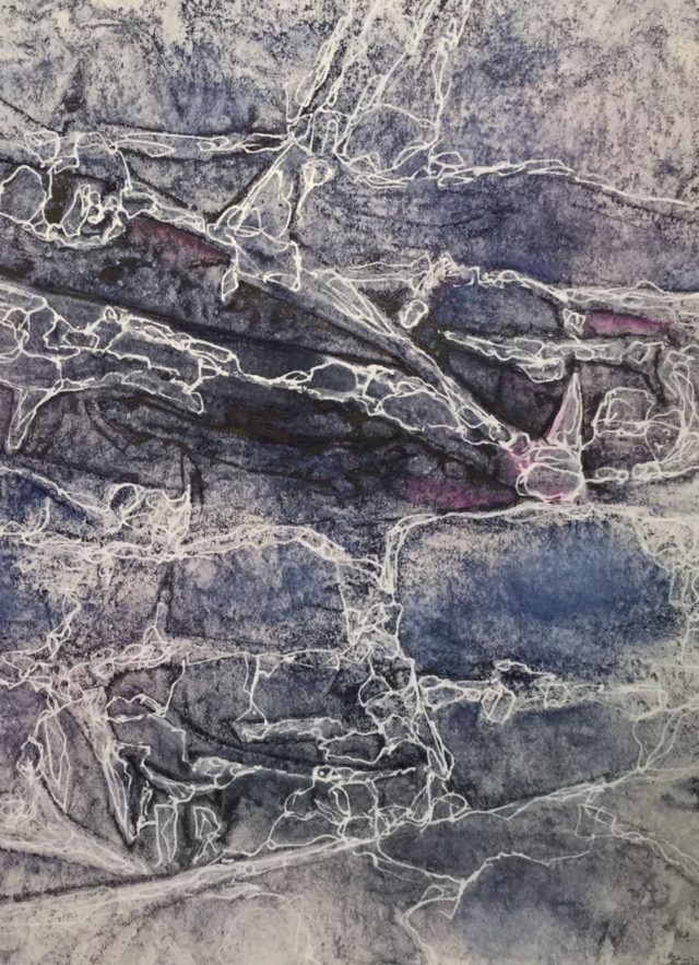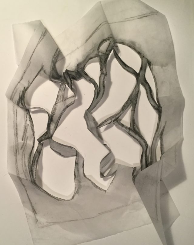 After this stage, I’m ready to start cutting out the design with a craft knife. I use blue tape to temporarily adhere the tracing paper to the watercolor paper and cut through both layers at once. The tracing paper drawing often looks like this when I’m done: