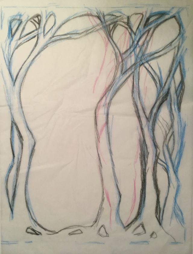 Drawing is a way of thinking for me, and Prismacolor Art Stix are my favorite tools for working out ideas — they glide so easily over the tracing paper! I typically begin with a rough version in a single color, then make adjustments in contrasting ones until I get something that seems to work. You can see the process in this early sketch for one of the panels for Keeping Secrets: