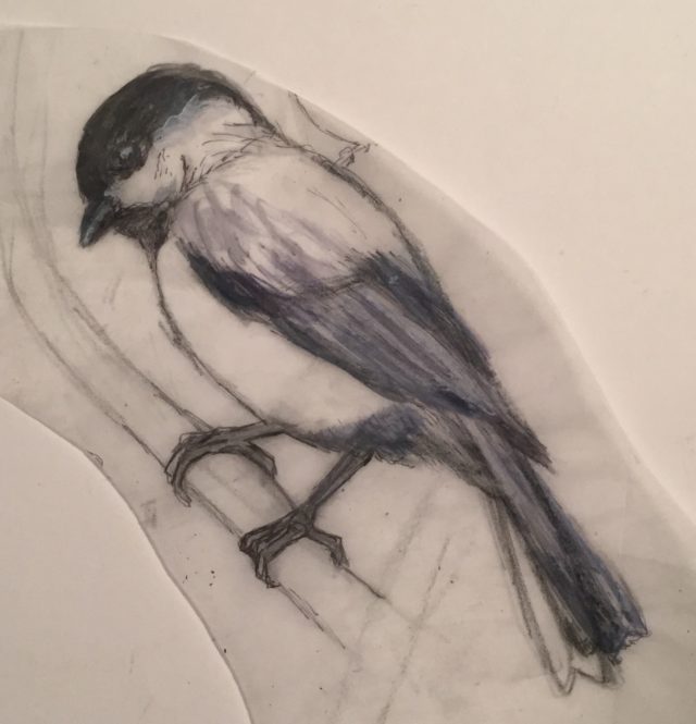 Sometimes I’ll make adjustments in white gouache and/or ink, as in this chickadee sketch for Tales of the Understory, Part III: