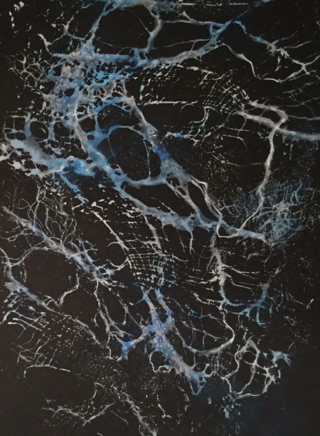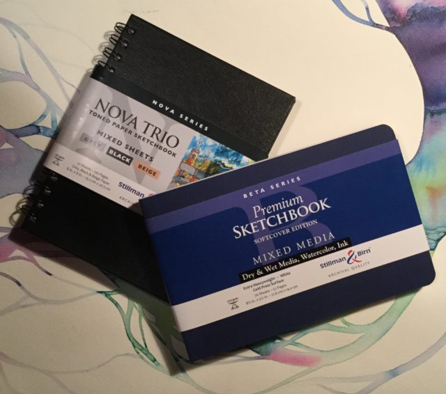 I‘m very impressed with the quality of the paper in the Stillman & Birn line of sketchbooks! It’s great how wet you can get it; paper buckling is so much less than other brands I’ve tried. I’m also enjoying their toned paper as a quick way to test out techniques. Here’s the cheesecloth texture from Mystery Technique #75, looking very different on black paper: