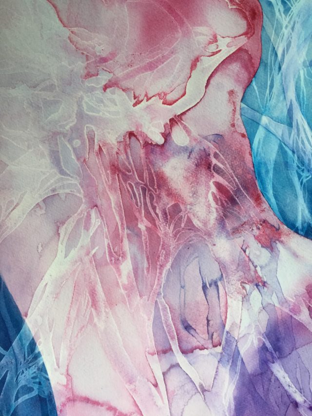 You can get interesting “ghost” shapes with acrylic medium and watercolor glazes. To avoid pencil lines, I started by drawing tangled linear shapes with a brush filled with water. Next I added diluted gloss medium to the watery lines. After this layer dried, I applied green and blue watercolor glazes with some granulation medium in the blue to increase the texture. The ghost shapes of acrylic medium partially resist the watercolor and show through the other layers to increase the sense of depth. Here’s another example: