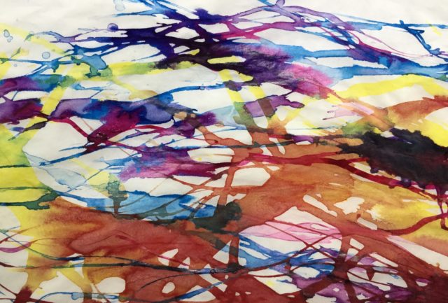 White acrylic ink to the rescue! This is part of a sky demo that got too dark and flat in places, so I decided to experiment with some white acrylic ink glazes to lighten the area and add some visual interest. I created a mixture that was equal parts water, white acrylic ink, and Winsor & Newton Granulation Medium. Next I got the paper wet and floated the diluted ink over parts of the painting, tilting the paper to allow the paint to flow and add specks of white on top of the dark. I used a wet brush in places to manipulate the granulated white.