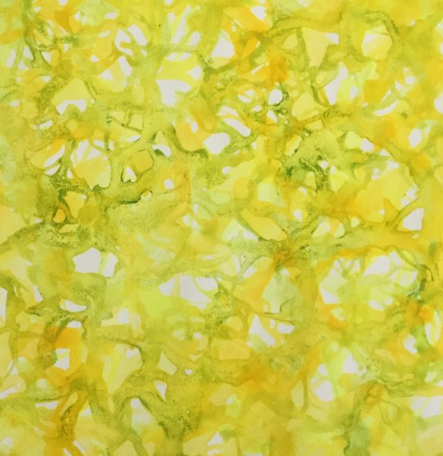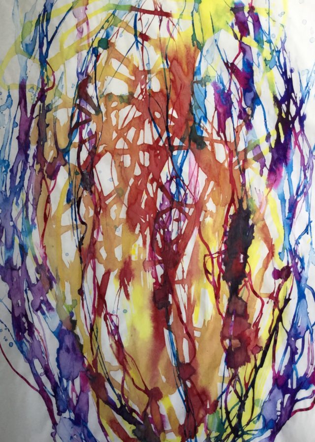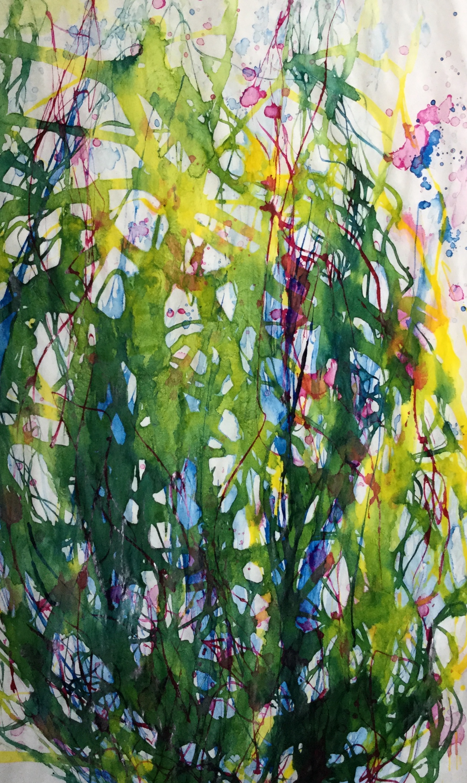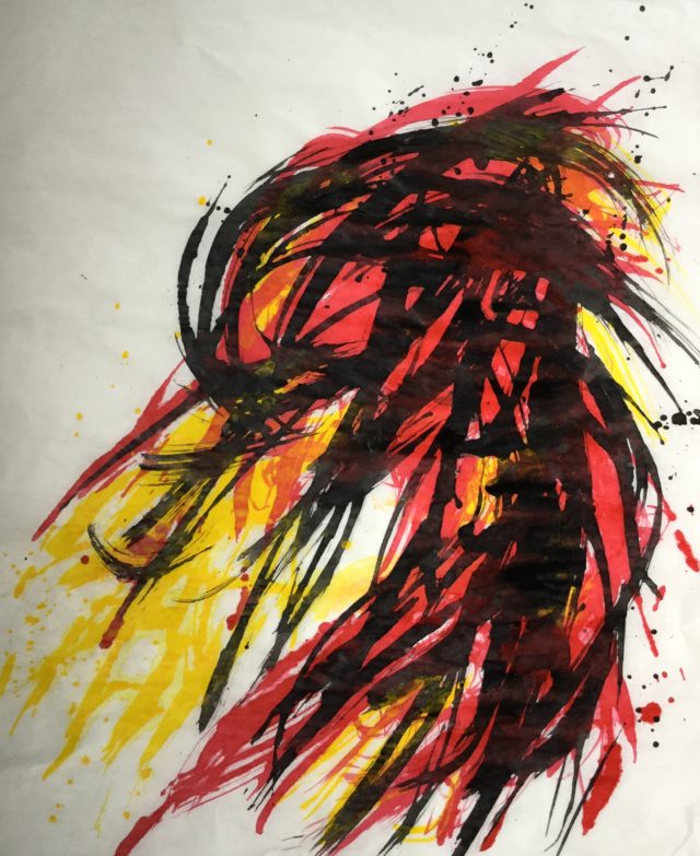 This painting represents an exciting new direction for me! I’ve started doing “energy paintings” as a warmup exercise. It’s a great way to loosen up and explore the emotional energy of different color combinations. These are all quickly done with liquid acrylic on large sheets of recycled paper left over from the Lantern Festival: