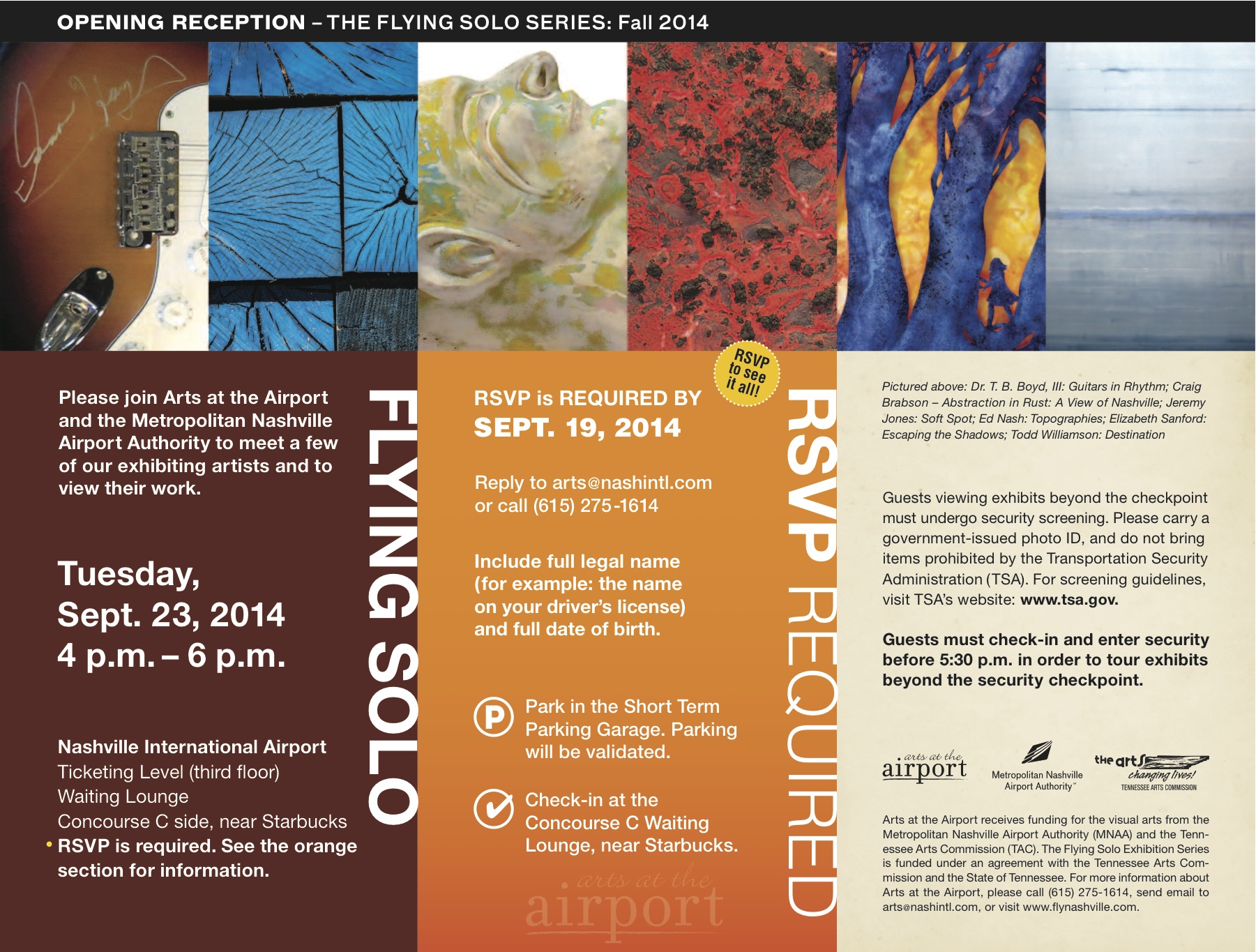 | OPENING RECEPTION – The Flying Solo Series: Fall 2014Please join Arts at the Airport and the Metropolitan Nashville Airport Authority to meet a few of our exhibiting artists and to view their work.