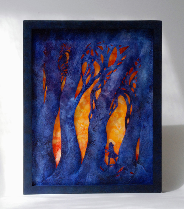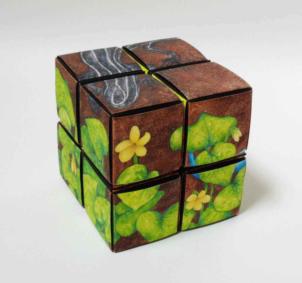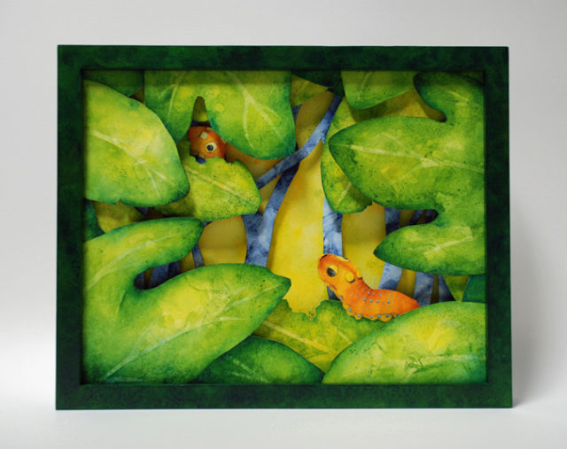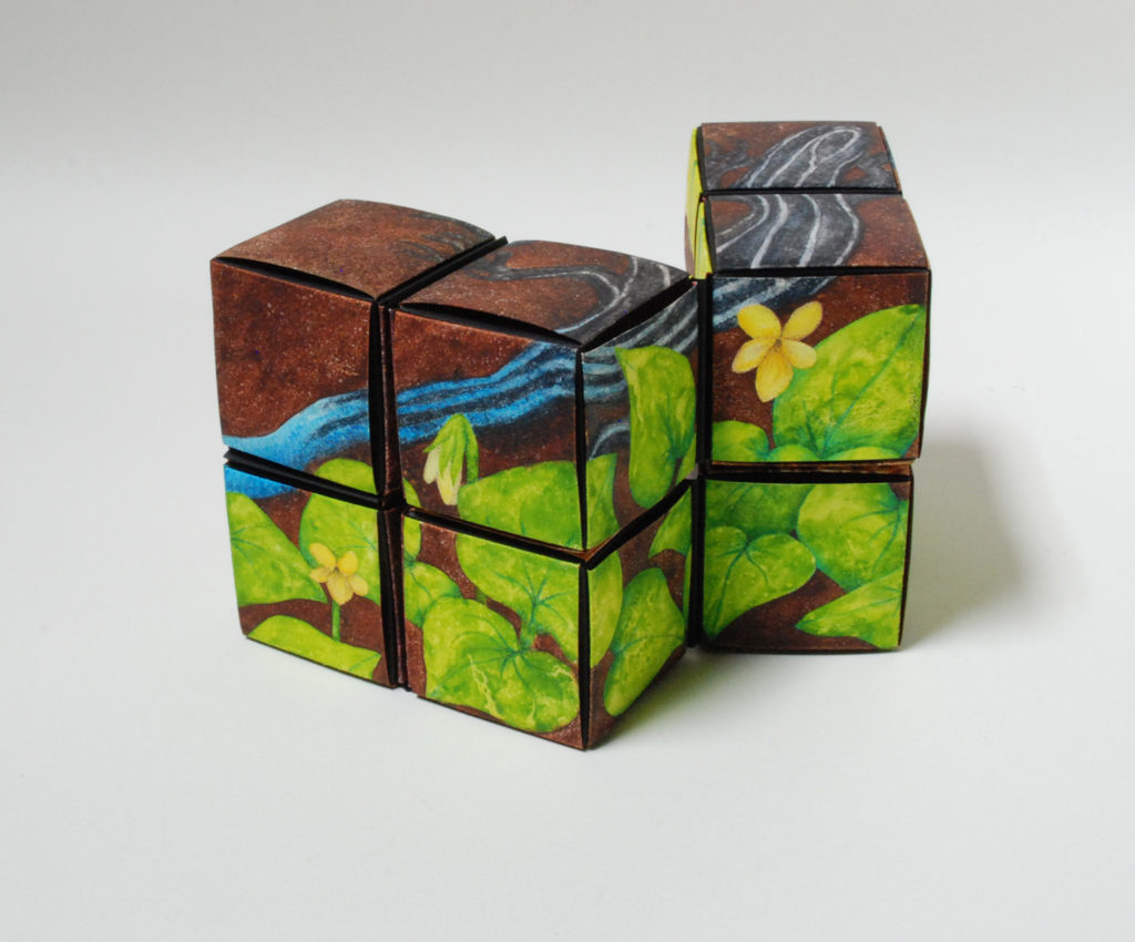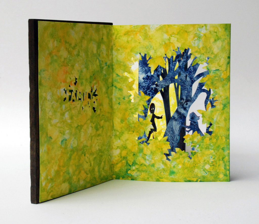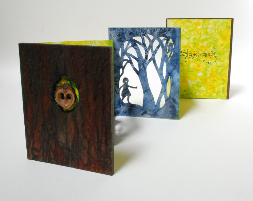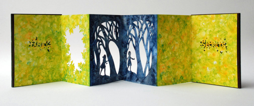 I’m a watercolor painter who discovered the world of book arts; now I paint visual fairy tales that unfold in the space between two and three dimensions. Water and time are my chief collaborators, and a craft knife is my favorite editing tool. I specialize in structures that transform in size or shape to reveal previously hidden figures or text. My stories are set along the shifting boundaries between the suburbs and the forest; you never know what you might find if you leave the manicured lawns behind and step in under the trees.