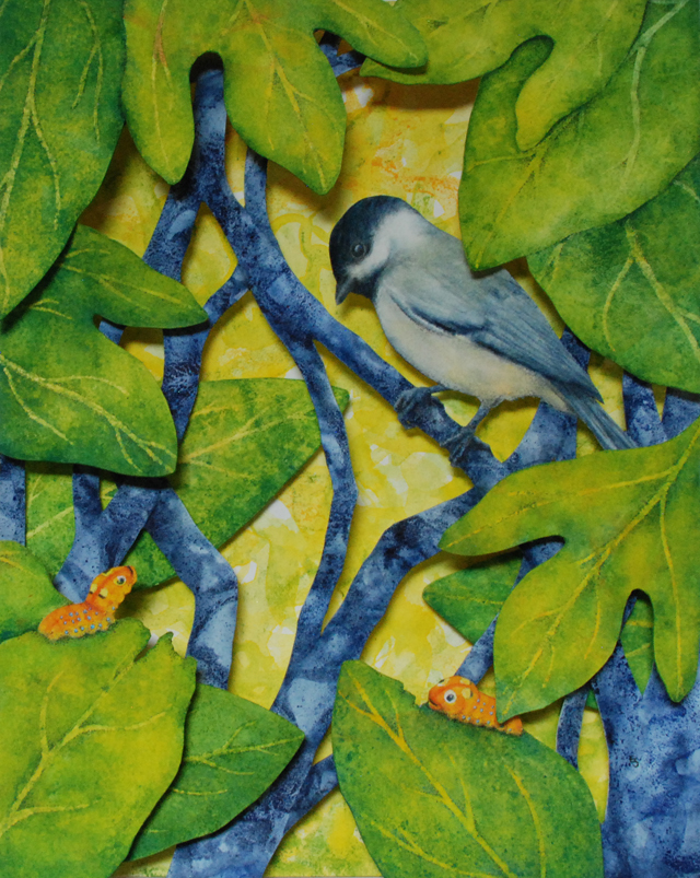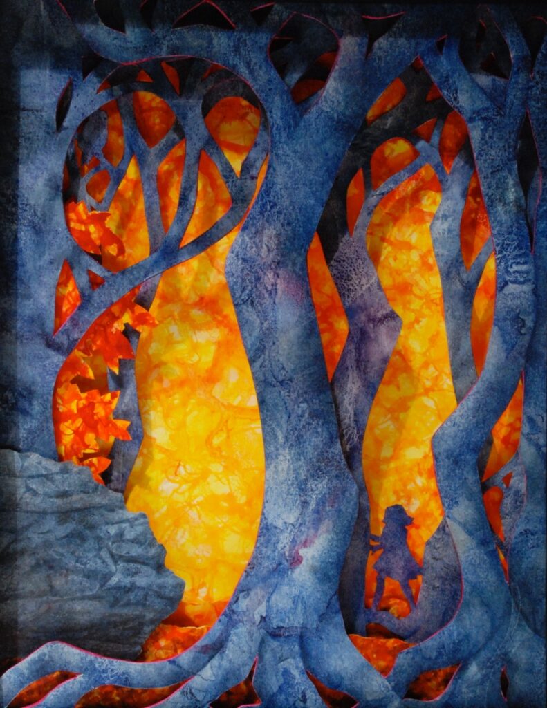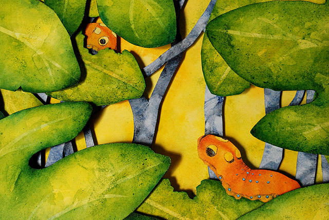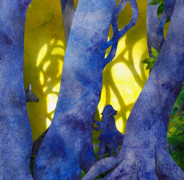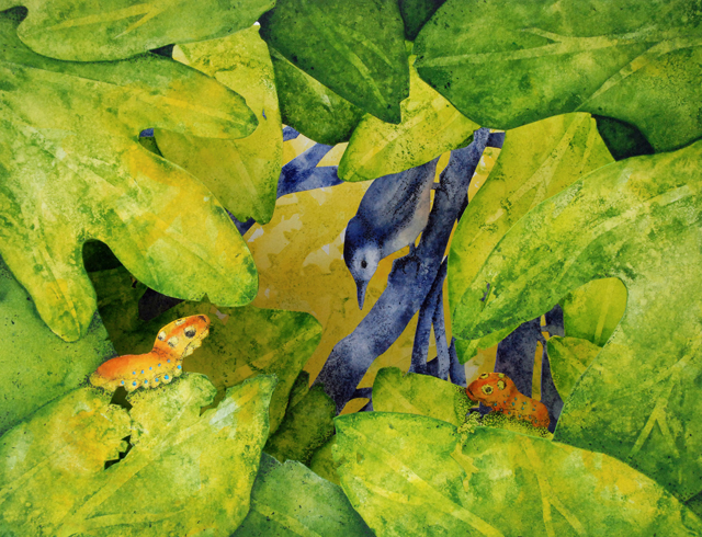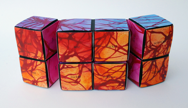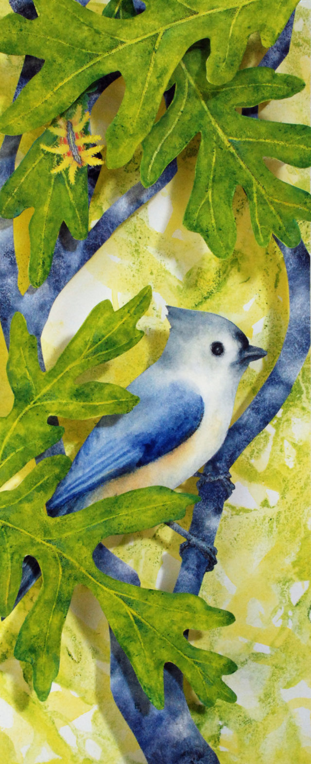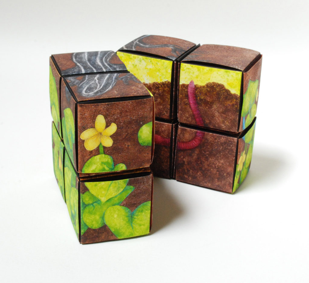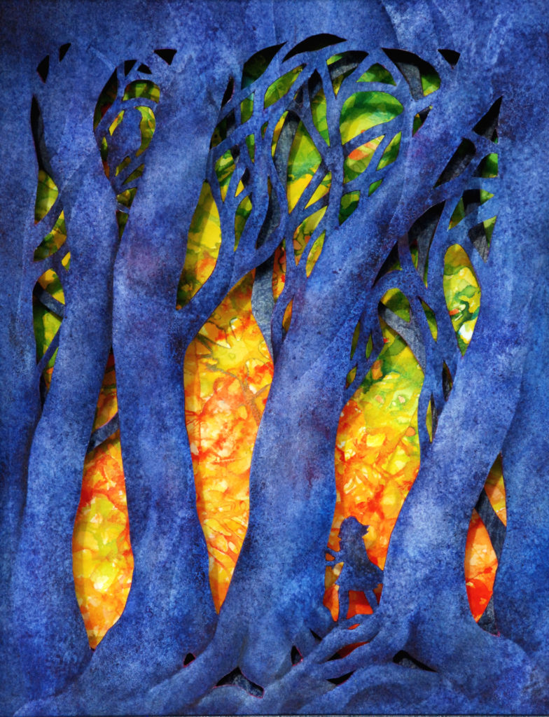 I’m a watercolor painter who discovered the world of book arts; now I paint visual fairy tales that unfold in the space between two and three dimensions. Water and time are my chief collaborators, and a craft knife is my favorite editing tool. I specialize in structures that transform in size or shape to reveal previously hidden figures or text. My stories are set along the shifting boundaries between the suburbs and the forest; you never know what you might find if you leave the manicured lawns behind and step in under the trees.